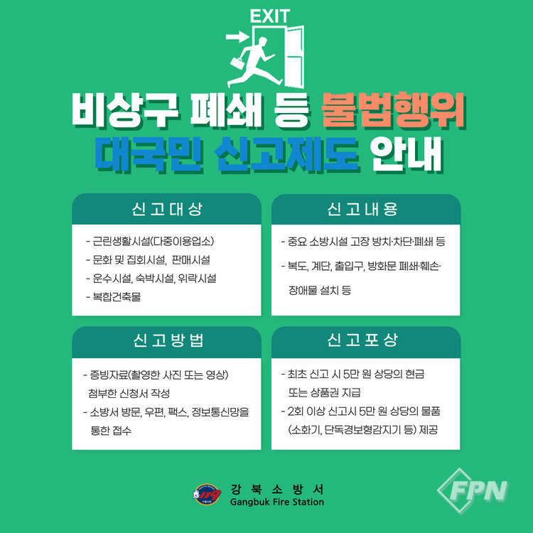[FPN 정재우 기자] = 서울강북소방서(서장 이상일)는 소방시설 등 불법행위에 대한 신고 포상제를 운영한다고 22일 밝혔다.