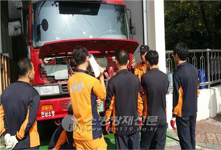 이날 교육은 전남소방본부 소방장비 규격 심의위원과 자체 이동정비반으로 활동 중인 화학119구조대 조경래 소방위를 교관으로 선정해 ▲특장전원 고장 시 방수 방법 ▲ 메인릴레이 고장 시 특장조작을 위한 응급조치 방법 ▲중계구 기능 및 사용 방법 ▲ 진공유지 불가 원인 및 조치방법 ▲지수밸브 기능 및 점검 방법 ▲각 에어 솔레노이드 밸브의 기능 및 비상조치 방법 ▲폼 및 분말 소화약제등 방사요령 ▲사다리(굴절식, 직진식)차량의 특장계통 응급조치 방법 ▲PUMP 사용시 주의사항 등 소방차량의 원리에 대한 이론적인 부분과 실습을 통한 심도있는 교육을 실시했다.