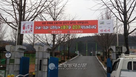 이번 플래카드는 증평소방서에서 자체 기획한 제 1회 소화기와 감지기 그림 그리기대회에 참여한 관내 초등학교 4개소(도안초등학교, 삼보초등학교, 죽리초등학교, 증평초등학교)에 설치해 소화기와 단독경보형 감지기 자율 설치를 독려하고자 추진됐다.