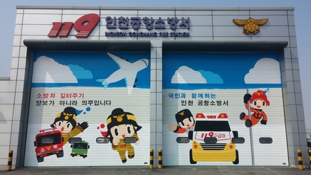 인천공항소방서(서장 이철호)는 주변 환경과 소통하고 새로운 소방이미지를 제공하기 위해 소방서 차고문에 그림으로 경험하는 소방홍보를 위해 ‘영이’와 ‘웅이’ 소방캐릭터를 활용한 산뜻한 그림으로 새롭게 단장해 시민의 눈길을 끌고 있다.