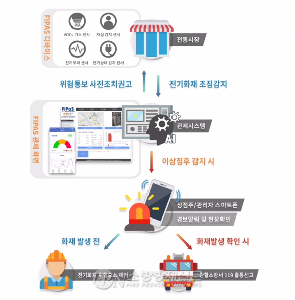 스마트 화재감지ㆍ제어시스템 ‘FiPaS’는 가스나 저항성 누전전류, 과부하 등 각종 화재 발생 위험요소를 각종 센서로 감지해 전기안전 현장 담당자와 상점주 등에게 전파하는 초기 화재 예방 통합 관제 시스템이다. 이 시스템은 대전광역시 대전정보분화산업진흥원이 주관하고 미래창조과학부가 지원한 연구 개발사업을 통해 개발됐다.