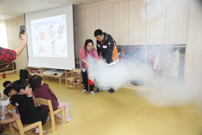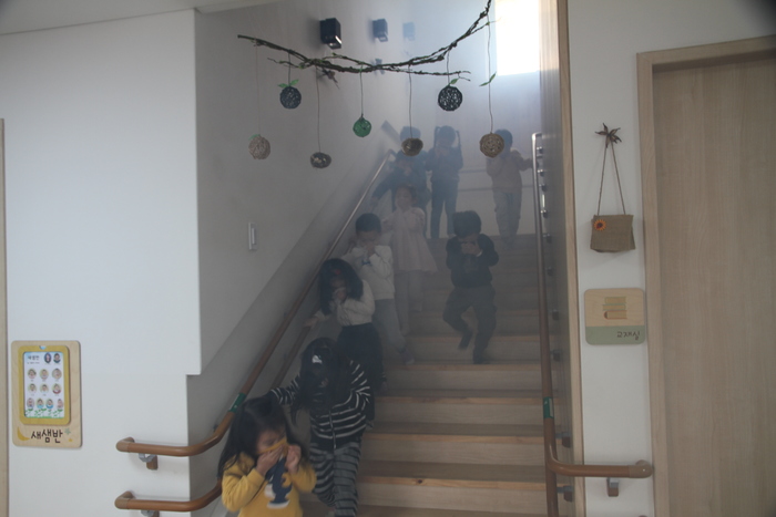 이날 어린이들은 화재 시 신고요령과 대피방법을 숙지하고 선생님들은 소화기를 사용한 신속한 초기 소화와 안전한 대피유도방법을 배웠다. 소방안전교육이 끝난 뒤에는 화재가 발생한 상황을 가정해 대피 훈련이 진행됐다. 훈련에서는 어린이들이 선생님들의 지도 하에 젖은 수건이나 옷으로 코와 입을 막고 자세를 낮춰 질서있게 건물 밖까지 안전하게 대피했다. 어린이집 선생님은 “매달 자체적으로 대피훈련을 하고 있지만 소방관이 직접 알려주고 함께 훈련을 하니 교육효과가 훨씬 큰 것 같다”며 “오늘 배운 내용을 바탕으로 어린이들에게 주기적인 반복교육을 실시하겠다”고 말했다.