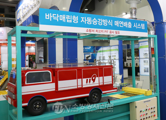 청구이노베이션(주)(대표 하상순)는 이번 박람회를 통해 성능이 한층 업그레이드된 소방차 배기가스 배출시스템을 소개했다. 바닥에 매설된 후드를 소방차량에 근접시켜 배기구에서 나오는 Nox와 CO, HC, PM 등의 유해가스를 포집한 뒤 전동댐퍼를 통해 이를 다시 외부로 배출하는 방식으로 특허까지 출원한 상태다.