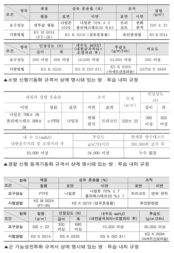 소방청 관계자는 “신형 기동화의 경우 일선의 요구로 규격 변경이 이뤄진 것”이라며 “현장 대원들은 등산 신발과 같이 고기능성의 방ㆍ투습 제품을 원했고 이를 반영하기 위한 연구에서도 당연히 검증을 마친 원단들을 기본 잣대로 삼지 않았을까 판단된다”고 말했다.