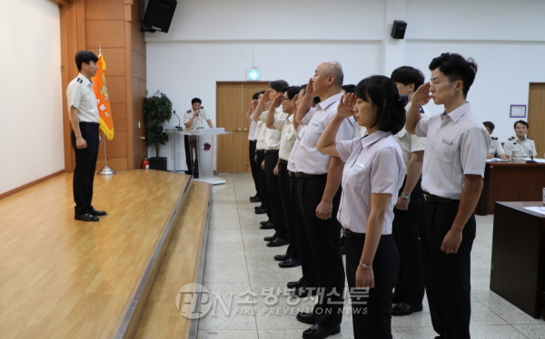 이날 신규 발령 6명, 정기 인사발령에 따른 전입 소방공무원 9명에 대한 신고식이 진행됐으며 각 과 팀ㆍ과장이 참석해 신규 임용과 인사 발령된 직원들을 축하했다.
