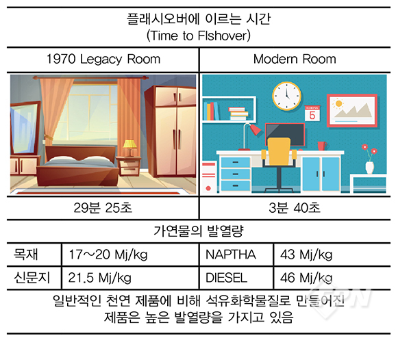 이는 가정 내 화재 하중과 열량이 예전보다 2~4배 높아졌다는 것과 화재가 발생하고 플래시오버에 이르는 시간도 상당히 빨라졌다는 것을 의미한다.