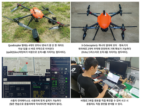 대부분의 기성품 기체는 8개 모터 구동 방식으로 비행시간이 줄어드는 옥토콥터 방식을 선호하지 않지만 비행 시간보다 사고 예방이 더 중요한 소방드론에서는 꼭 필요한 기능 중 하나다.
