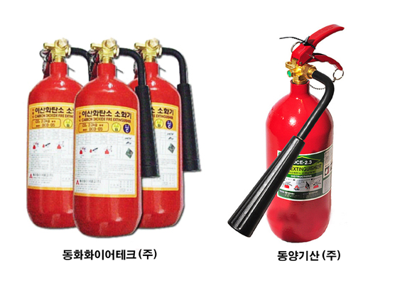 이산화탄소는 방출될 때 단열팽창에 따라 온도가 저하되면서 드라이아이스를 형성하고 그 냉각작용을 통해 소화를 돕는다. 장시간 보관해도 변질이나 용기 부식 등이 없으며 방사된 후에는 가스상태가 되기 때문에 좁은 공간에서도 침투가 수월하고 전기에 대한 절연성 및 방사 후 소화약제에 의한 2차피해를 막을 수 있다. 이에 따라 약제사용 후 정비나 수리가 곤란한 정밀기기나 전기기기, 차량 등에 비치하는 경우가 많다. 반면 이산화탄소는 다른 소화약제에 비해 소화효과가 비교적 적은 편이며 고압용기를 사용해 제품이 무겁고 가격이 비싸다는 단점을 갖고 있다. 또 밀폐된 공간에서 사용하게 되면 산소농도를 떨어뜨려 산소결핍으로 인한 질식 우려가 있으며 인체에 직접 방사했을 경우에는 순간 온도가 영하 50℃~70℃까지 떨어져 동상피해가 나타날 수 있어 주의가 요구된다. 국내에서 이산화탄소소화기를 생산하는 업체는 동아화이어테크(주), 동양기산(주), (주)오일금속, (주)nk, 조경산업(주), (주)핌코리아, (주)에드코리아 등이 있다. ■ 할로겐화합물소화기