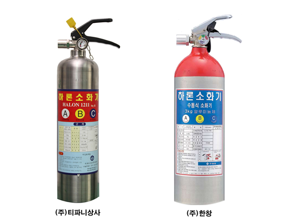 우리나라에서는 할론1211이나 할론1301, 할론 1011, 할론 2402 등의 할론가스 중 할론1211과 할론1301 소화기만 생산하고 있다. 할로겐화합물소화기는 이산화탄소소화기와 마찬가지로 가스상태로 방출됨에 따라 소화 후 약제 잔재물이 남지 않아 가정이나 산업체, 판촉물, 자동차, 특히 컴퓨터 및 자동제어 분야와 통신설비, 선박 등 많은 장소에서 전반적으로 사용되고 있다. 하지만 목재화재 시에는 용량에 비해 소화능력이 떨어지고 분말소화기보다 가격도 비싸다는 단점을 갖고 있다. 특히 ‘오존층보호를 위한 몬트리올의정서’에 따라 우리나라에서는 2010년부터 하론 소화약제의 생산 및 수입이 금지되면서 필수용도를 제외한 곳에서는 지속적으로 사용할 수 없다는 한계성이 있다. 현재 유일하게 국내에서 하론소화약제를 활용한 소화기를 생산하는 제조사는 (주)한창(하론 1301)과 수입전문 업체인 (주)티파니상사(하론 1211)가 있다. ■ 하론대체 가스소화약제 소화기
