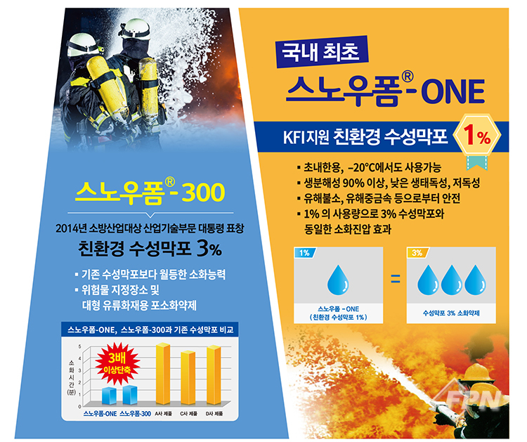 지난 2014년에는 소방산업대상 산업기술부문에서 대상인 대통령표창(스노우폼-300)을 수상했으며 2018년 국내 최초 개발한 친환경 초내한수성막포 1%(스노우폼-ONE, 사용온도: –20 ~ 30℃)는 한국소방산업기술원의 지원사업으로 선정돼 개발된 제품입니다.