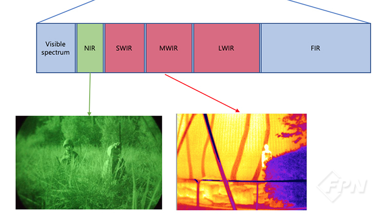 열화상 카메라(Thermal Imaging)뿐만 아니라 영상 증폭(Image Intensification), 수동조명(Active Illumination)도 야간투시경의 범주로 볼 수 있습니다. 그런데 사용하는 재료가 다릅니다. 야간투시경은 가시광선과 가까이 있는 적외선(NRI, Near-infrared) 영역으로 반사된 빛을 증폭해 이미지화 되는 특성을 가진 파장을 이용합니다.