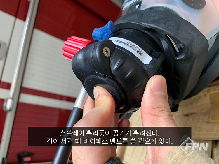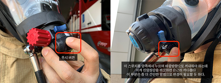 1. 호불호가 갈리는 대기-양압호흡 전환방식 기존 제품과 대기-양압호흡의 전환방식이 매우 다르다. 기존 제품은 양압호흡 상태에서 다이얼을 대기호흡으로 돌리고 푸쉬 버튼을 누르면 됐는데 이 제품은 푸쉬 버튼을 누르고 턱 쪽에 있는 대기호흡 버튼을 당기고 공급밸브를 아예 분리하는 방식. 그런데 이게 장갑을 끼고 할 경우 그리 쉽지만은 않아서 이 부분에서 좀 호불호가 많이 갈릴 듯하다. 애초에 대기호흡-양압호흡 다이얼을 쓰는 나라가 우리나라 밖에 없다고는 하는데 기존의 방식에 너무나 익숙해져 있어서 인지 개인적으로 적응하기 쉽진 않았다.
