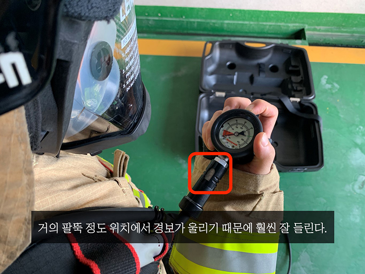1. 압력게이지에 있는 경보장치 기존의 제품은 공기 부족 경보 휘슬이 뒤쪽에 있어 팀원들과 같이 있을 때 누구 휘슬이 울리는지 바로 알지 못하고 ‘내 껀가’ 하면서 압력게이지를 확인해야 했다. 심지어 소음이 심할 때는 이 휘슬 소리마저 듣지 못하는 경우도 더러 있다. 이 제품은 휘슬이 압력게이지 바로 밑에 위치하고 있어 거의 바로 옆에서 울려주기 때문에 기존 제품보다 더 명료하게 경보를 인지할 수 있다.