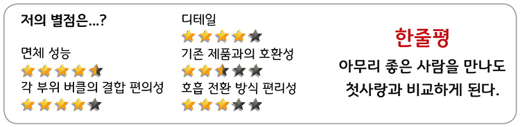 그 밖에도 크게 외형적으로 기존 제품과 다른 점들은 실린더 메인벨브와 결합 부분이 ㄱ자로 꺾여 있다는 것, 면체 마스크 실리콘 부분이 투명한 재질로 돼있다는 것 그리고 허리나 가슴 버클의 방식이 다르다는 것 정도가 되겠다. 아무래도 최근에 만들어진 제품이다 보니 깔끔한 디자인과 손쉬운 사용에 많이 신경을 쓴 게 보였다.