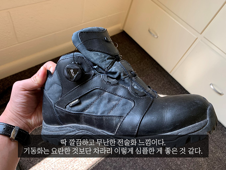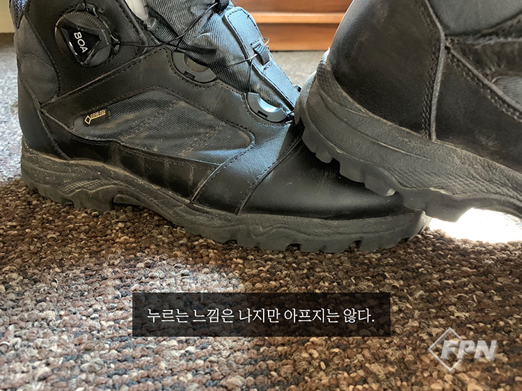 착용감 착용감은 그냥 일반적인 경등산화 수준이다. 그래도 이전에 납품된 기동화보다는 훨씬 나아서 전반적으로 발을 잘 잡아준다. 또 하나 강조하고 싶은 것은 뒤꿈치 라인을 매우 잘 잡아준다는 것. 뒤꿈치부터 아킬레스건을 아주 편안하게 잡아줘 와이어를 세게 조이지 않았을 때 오는 철퍽거림을 방지해준다. 평소 출동이 없을 경우 BOA 와이어를 살짝 풀어놓고 다니는 필자 같은 사람들이 매우 좋아할 만한 부분.