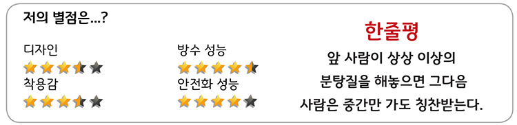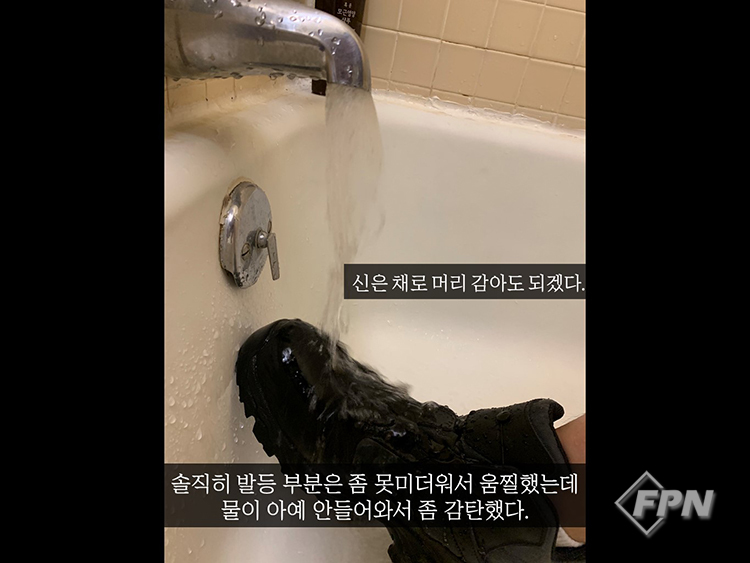 군용 전투화 베이스에 고어텍스 소재가 들어간 만큼 방수 성능은 정말 수준급이다. 샤워기로 대놓고 물을 쏴도 절대 안 들어온다. 사실 방수성능은 신발의 내구성과도 깊은 연관이 있다. 신발의 내구성이 낮아 접착 부분이 떨어지거나 하면 아무리 방수를 잘해놓아도 그 틈으로 물이 새어 들어오기 때문이다. 허나 이 신발은 아직 그런 부분은 없어 보인다. 이제 소방차량 운전원분들 발이 젖어서 철퍽거리는 모습을 보지 않아도 되는 건가.
