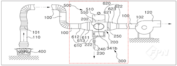 이외에 관계인이 수시로 점검할 수 있는 내부 점검창(부호 221)과 불연성 기름 찌꺼기 등을 정기적으로 청소를 할 수 있도록 청소 배출구(부호 220, 221)와 이물질 걸림망(부호 250)으로 구성됐다.