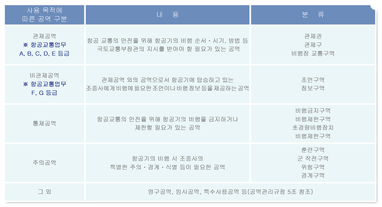 1. 관제공역 항공교통 안전을 위해 항공기의 비행순서 시기와 방법 등 국토교통부장관의 지시를 받아야 할 필요가 있는 공역이다. 항공교통업무에 따라 관제권, 관제구, 비행장 교통구역으로 분류한다.