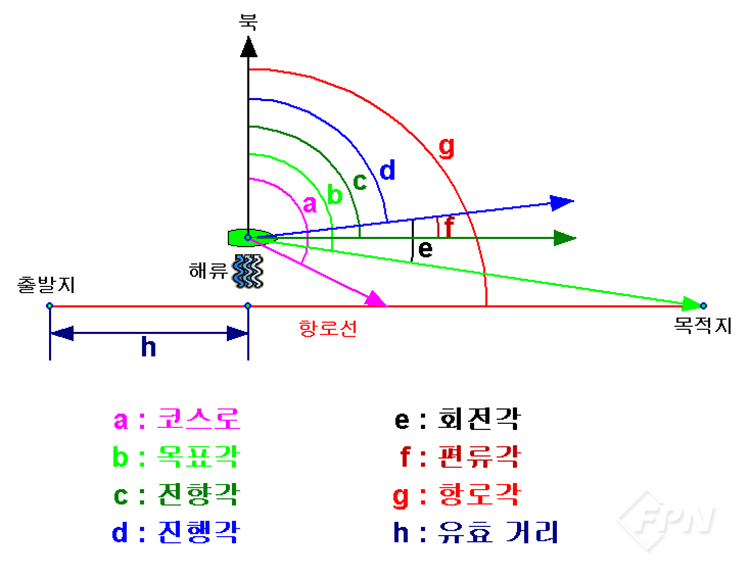ㆍ항로각(Course) : 항법 실행 중 출발지를 기준으로 한 목적지 방향의 방위각이다. 경로 항법을 실행 중일 때에는 이전 지점을 기준으로 한 다음 지점 방향의 방위각이다([그림 6]의 g 참조).