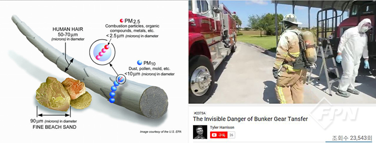 이해를 돕기 위해 현장에서의 오염물질이 어떠한 경로로 이동해 소방관의 건강을 위협하는지 좋은 실험 영상이 있어 소개해 본다. 왜 현장에서의 보건관리와 아래 기술할 오염제거(Decontamination), 활동 구역의 분리가 중요한지 확인할 수 있을 것이다.