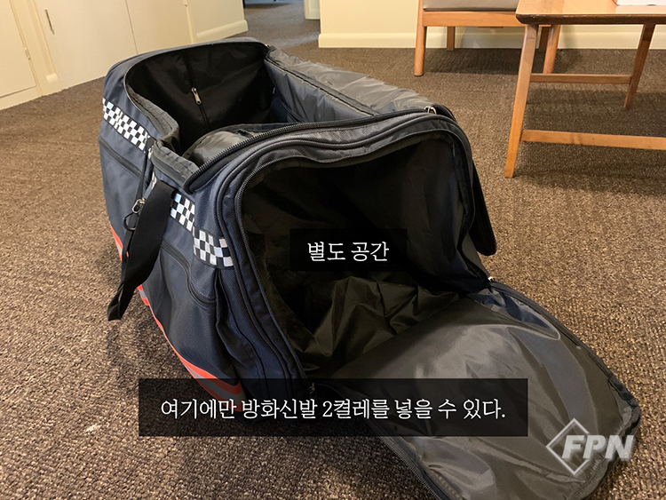 이 캐리어에서 가장 칭찬하고 싶은 점이다. 가방 윗부분에 방화신발을 따로 분리해서 담을 수 있도록 주머니가 분리돼 있다. 사실상 오염물질이 가장 많이 체류하는 부분이 바로 이 방화신발인데 이를 다른 장비들과 분리ㆍ보관해 다른 장비들의 오염을 방지할 수 있다. 앞서 언급한 오염 물질 차단의 덕목을 가장 잘 보여주는 부분.