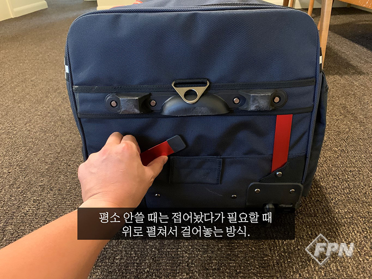 캐리어의 무게중심은 어느 정도 내용물이 채워져 있을 때를 기준으로 설계됐다. 상대적으로 덜 채운 상태에서 캐리어를 세우면 무게중심이 앞으로 쏠려 쓰러진다. 이러면 운반할 때 은근히 신경 쓰이고 불편한데 이 점을 해결하기 위해 쓰러짐 방지 홀더가 설치돼 있다. 이걸 펴서 끼우면 쓰러짐 현상이 거의 없다. 큰 문제는 아니지만 이런 사소한 장치에 신경 쓰는 것이 사용자로 하여금 큰 만족감을 느끼게 한다.