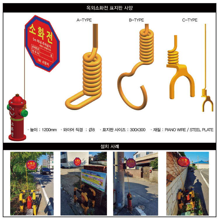 공장이나 학교, 주택가 등 건물 외부나 도로에서 소화용수의 원활한 공급을 위해 설치하는 옥외소화전 위치를 파악할 수 있도록 개발한 ‘옥외소화전 표지판’입니다.