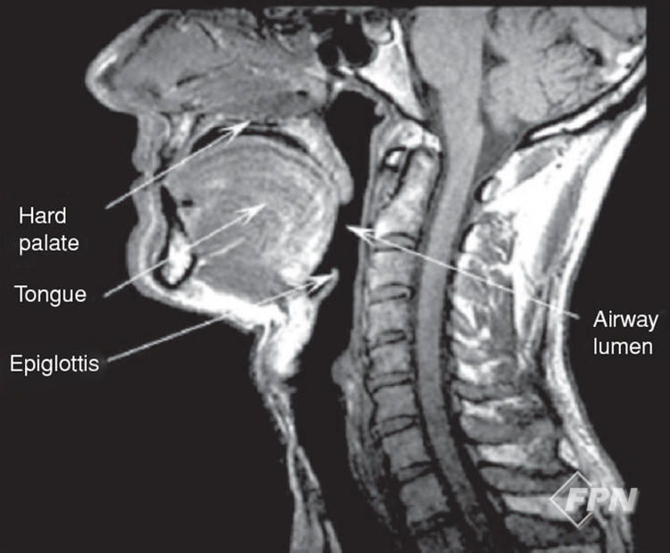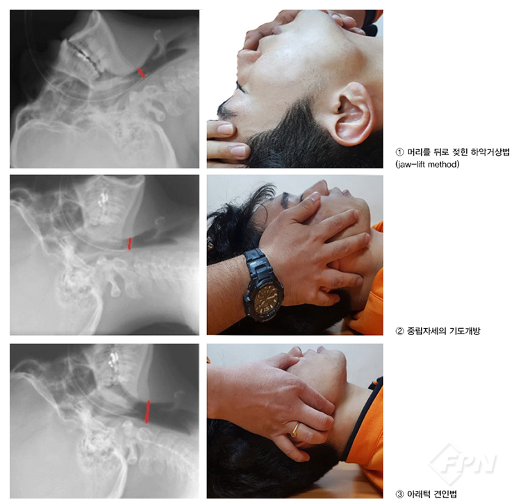 뇌 손상 초기 의식변화는 호흡 능력 소실과 혀의 처짐(이완)으로 이어지는데 처진 혀 근육은 [그림 1]과 같이 상기도를 막아 더욱 심한 저산소 혈증 상태를 만든다.