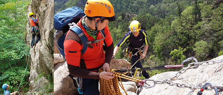 ③ 이중 프루직 확보 설치 이중 프루직 확보가 제대로 작용하려면 정확하게 프루직 매듭을 설치하고 다뤄야 한다. 8㎜의 코드로 만든 두 개의 프루직 고리 중 하나는 48㎝, 나머지 하나는 56㎝로 만든다. 두 고리를 프루직 매듭으로 로프에 세 번 감아 연결한다.