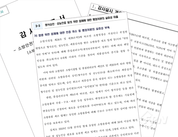 감사원에 따르면 실제로 지난해 11월 기준 동일한 소방용품에 대해 50개 이상의 형식승인과 성능인증 번호를 보유한 업체는 각각 12곳과 2곳에 달했다.