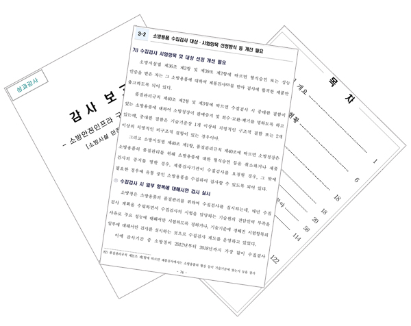 감사원에 따르면 소방청은 소방용품의 품질관리를 위해 수집검사를 하는데 매년 수집 검사 계획을 수립하면서도 시험을 담당하는 검사기관(한국소방산업기술원)의 전담인력 부족 등을 사유로 주요 성능에 대해서만 시험하거나 기술기준에 정해진 시험 항목의 일부만 검사를 실시하는 방법으로 제도를 운영해 왔다.