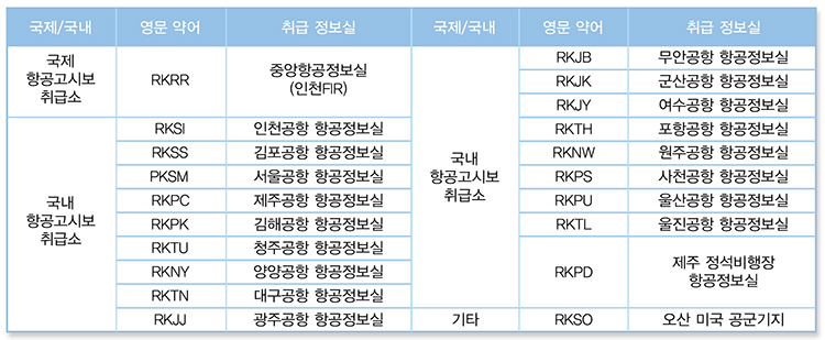 ② 발행 취급소(LOCATION) 항공고시보를 발행한 취급소를 의미하며 각 문자에 대한 취급소는 아래와 같다.