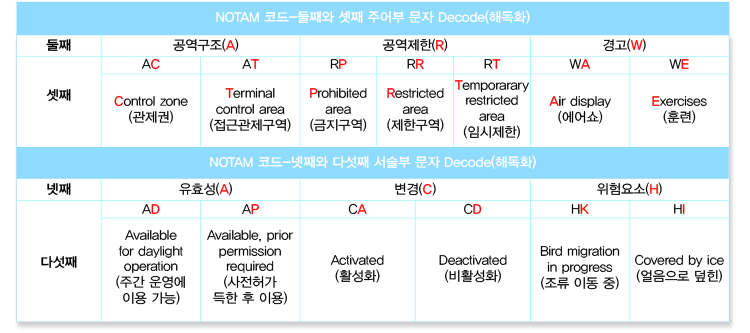 ※ V series는 화산재고시보, Z series는 GNSS의 상태에 관한 정보다. ④ 항공고시보 부호(QCODE) 항공고시보 부호(QCode)란 항공고시보 본문의 주제와 주제의 상태를 포괄적으로 나타내는 다섯 개의 영문자로 조합된 부호다. 첫 번째 문자는 항상 ‘Q’로 시작하고 둘째, 셋째 문자는 주어부, 넷째, 다섯째 문자는 서술부로 구성된 문자 그룹을 말한다.