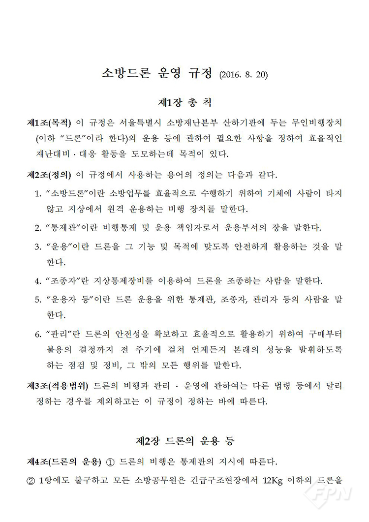 드론기체 매뉴얼은 기체의 올바른 사용을 위한 기본적인 참고 사항은 될 수 있어도 현장에 접목해 다양하게 응용하거나 소방 환경에 맞는 관리를 하기 위한 기준은 될 수 없어 소방드론운용규정(매뉴얼) 필요성을 더욱 절감하게 했다. 그래서 부족하지만 자료와 현장경험을 바탕으로 한 소방드론 운용규정 정립을 시작했고 이는 드론을 운용하는 공공기관에서는 최초였다. 결국 첫술에 배부를 수 없다 해도 첫걸음의 시도가 필요했다.