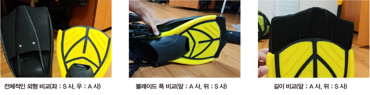 2. 제품별 외형 비교 이제 각 핀의 외형적 비교를 해보겠습니다. S 사의 핀을 기준으로 했는데 굳이 급류구조용 핀이라 알려진 A 사의 핀을 기준으로 하지 않은 이유는 S 사의 R핀이 소방서에 많이 보급된 핀인 데다가 비교의 주된 목적 중 하나가 ‘급류구조 활동 시 스쿠버다이빙용 핀은 괜찮은가?’라는 이유도 있기 때문입니다. 비교 시에는 275㎜의 웻슈트 부츠를 착용했습니다.