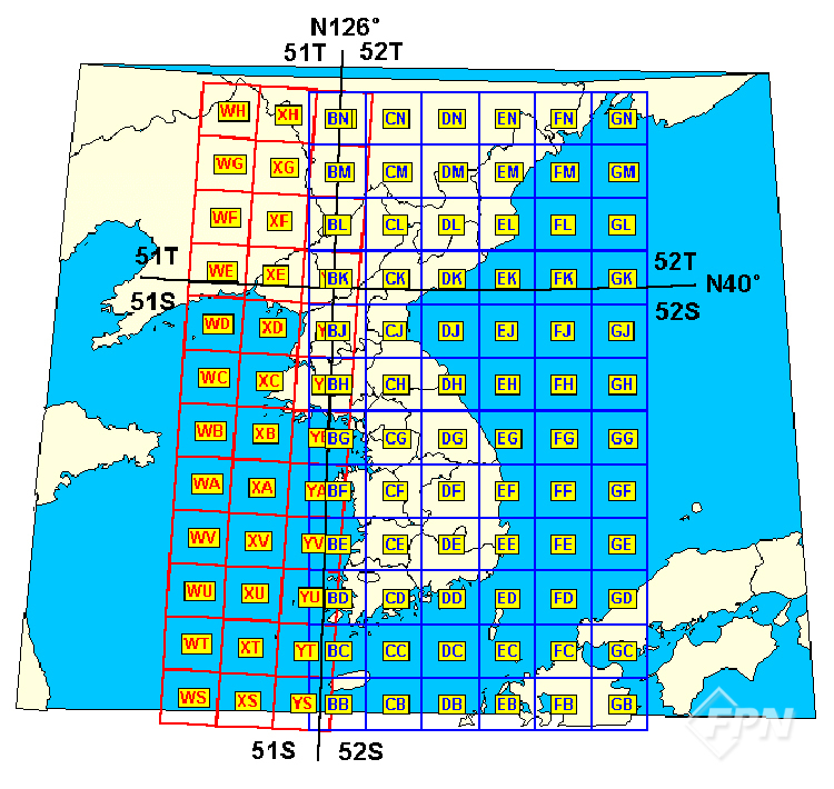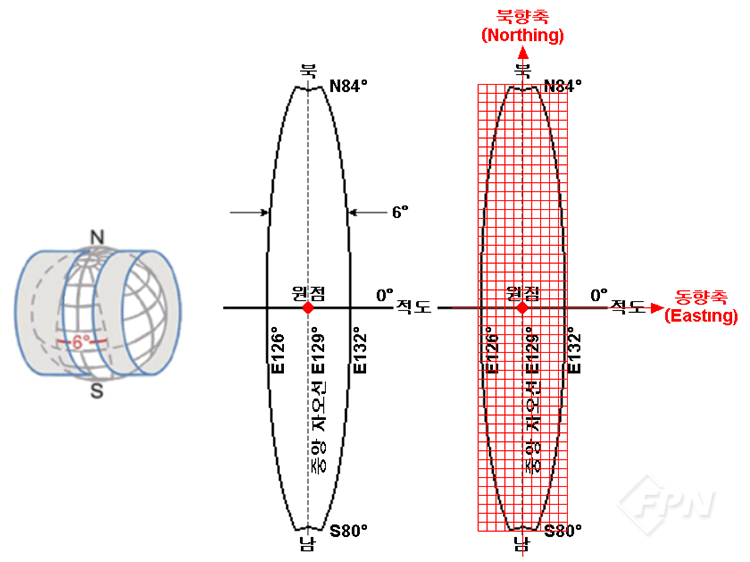 우리나라는 E129° 자오선에 원통을 접하게 해 E126°에서 E132°까지 투영한 52구역(Zone)에 속한다. 이 투영 범위에서 UTM 좌표계(빨간색)의 북향축은 중앙 자오선(E129°)을 따라 위치시키고 동향축은 적도를 따라 위치시킨다. 원점의 동향축 가산 수치는 500,000mN로 한다.