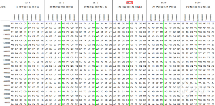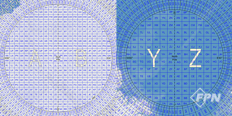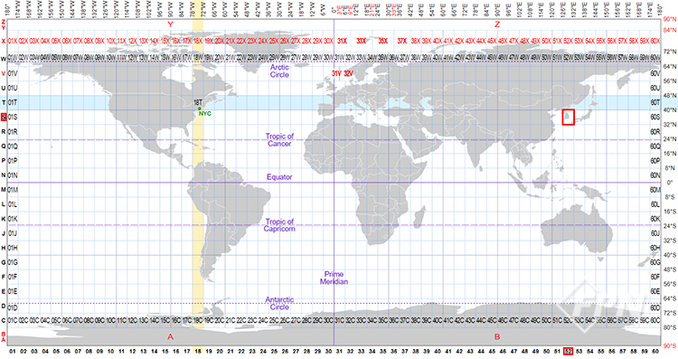 이때 알파벳 O, I는 숫자 0, 1과 혼란을 일으킬 수 있어 사용하지 않으며 C에서 X까지의 알파벳을 부여한다. C에서 W까지의 구역은 각각 위도 8° 간격이고 나머지 X 구역만 위도 12°(N72°~N84°) 간격이다. 따라서 C 구역부터 M 구역까지는 남반구에 위치하고 N 구역부터 X 구역까지는 북반구에 위치한다.