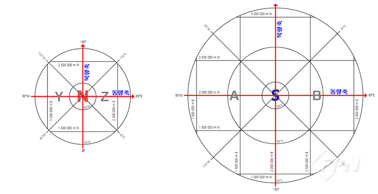 UPS 좌표의 위치를 보다 신속하고 편리하게 파악하기 위해 남극과 북극의 UPS 투영 지역을 각각 동반구와 서반구로 나눠 UTM 좌표계에서 사용하지 않은 알파벳 구역 문자 A와 B, Y, Z를 각각 부여한다. 구체적으로 [그림 5]와 같이 남극의 UPS 투영 지역에서 서반구를 A, 동반구를 B로 하고 북극의 UPS 투영 지역에서 서반구를 Y, 동반구를 Z로 한다.