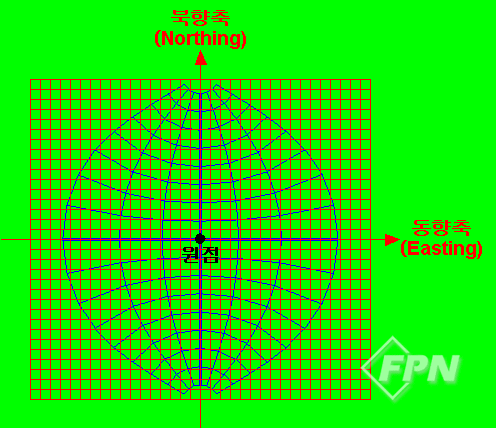 그리고 투영 지역이 원점에서 남쪽(아래쪽)으로 최대 45만m까지라면 원점의 북향 좌표 가산 수치를 500,000mN으로 적용한다. 그러면 원점에서 남쪽으로 45만m 떨어진 지점의 북향 좌표는 50,000mN이 돼 음수가 존재하지 않게 된다.