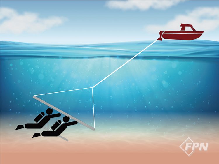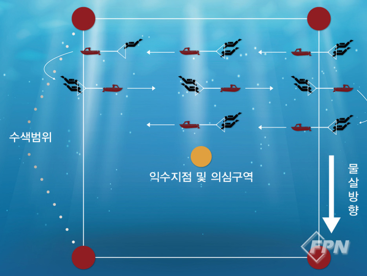 두 번째로 제시하는 방법은 ‘보트로 다이버를 견인’해 수색하는 방법이다. 이 방법은 시야가 확보되면 더욱 좋겠지만 그렇지 않더라도 보트로 다이버를 견인해 주기 때문에 수중에서 작업하는 다이버들은 스트레스를 덜 받는다.