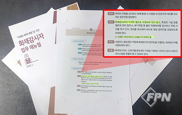 ![]() ▲ 고용노동부가 펴낸 화재감시자 메뉴얼에 명시된 자격기준 |