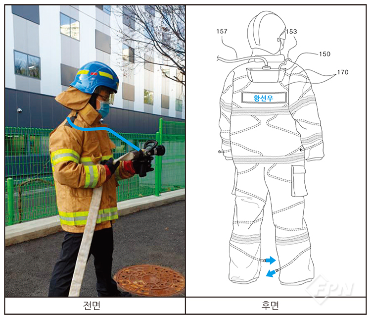 [소방관이 개발한 소방장비]냉각 기능과 음료수 제공 기능을 갖는 ‘소방용 방화복’일곱 번째 이야기이번 호에 소개할 발명은 소방용 방화복이다. 소방대원이 무더운 여름철 화재진압을 하는 경우 열사병을 방지할 수 있도록 방화복 전체 면에 일정한 간격으로 냉각수(얼음물)가 흐르도록 했다. 여기에 더해 소방대원이 언제라도 쉽게 냉수를 마실 수 있도록 고안됐다.