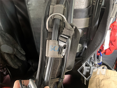공기호흡기 면체는 [사진 5]처럼 보관 주머니에서 꺼내 면체 스트랩을 안면부에 씌워 놓으면 신속한 착용과 안면부 보호 두 마리 토끼를 잡을 수 있다. 공기호흡기 가슴끈은 [사진 6]처럼 꽂아 놓으면 찾지 않고 바로 착용할 수 있다.