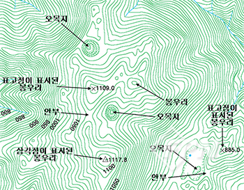 지형도에서 봉우리는 등고선으로만 표현되는 반면 오목지는 등고선에 빗살 무늬를 함께 표기해 봉우리와 구분하기도 한다([그림 1] 참조).