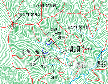5. 능선의 분기점 한 개의 능선이 두 개 이상의 능선으로 분기하는 지형을 능선의 분기점이라 한다. 이는 지형도에서 낮은 쪽을 향하는 등고선 뿔이 두 개 이상의 뿔들로 나뉘기 시작하는 지점이다. 나눠진 능선들 사이로 계곡이 형성되기 때문에 능선의 분기점을 계곡의 생성점이라고도 한다. 봉우리 자체도 능선의 분기점이 되는 경우가 많다([그림 2] 참조).