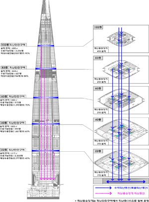 또한 고층에 거주하는 재실자의 안전한 대피를 위해 피난용 엘리베이터를 새롭게 설계에 적용하고 화재를 미연에 방지할 수 있도록 열화상감지설비 등 최첨단 화재감지 설비 역시 건축물 곳곳에 설치하도록 계획하고 있다. 이와 더불어 비상시 입주민들이 대피할 수 있도록 5개 층을 통째로 비워 피난안전구역을 확보하고 공기호흡기 및 인공소생기 등의 인명구조장비도 비치한다는 방침이다. 롯데그룹 관계자는 “소방시설의 경우 화재 및 재난을 조기에 감지하고 대처해 입주민은 물론 제2롯데월드 이용객의 재산과 인명피해를 최소화하는데 그 목적이 있다”며 “무엇보다 화재에 대한 안전을 최우선으로 설계ㆍ시공하고 있다”고 말했다. 새로운 시도, 국내 초고층 건축물의 기준이 된다 ▲ 자연압 활용한 연결송수관 설비의 특수설계 연결송수관 설비의 특수설계는 연결송수관 중간가압펌프를 이용해 상층부의 소방전용 수조를 충수하도록 구성하고 최상층을 제외한 다른 층의 방수구는 자연압으로 소화수를 공급하는 방식이다. 이때 배관계통의 이상압력 발생을 방지하기 위해 입상관 압력 배관용 탄소 강관이 적용되며 이를 통해 자연낙차 방식을 이용한 신뢰성 높은 소화수를 공급할 수 있게 된다. 또 고압배관 적용 구간이 줄어들어 배관 및 밸브 파손 위험이 낮아지게 되고 연결송수관 중간 가압용 펌프와 별도로 물탱크 상호간을 루프화해 소화수량을 증대시켜 최대 5시간 소화활동이 가능하도록 한다는 것이 롯데 측의 설명이다. 소방방재청 중앙기술심의위원회는 이 같은 설비의 설계를 놓고 연결송수관 펌프 및 독자적인 충수설비를 이용한 소화수 공급방식을 적용해 보다 지속적이며 안정적으로 소화수 공급이 가능하고 자연압을 이용한 소화수 공급은 기계적인 영향 없이 일정한 압력을 지속적으로 방수구에 공급해 설비의 신뢰성을 극대화 시킬 수 있다고 평가했다. ▲ 필요구간만 작동, 전실 제연설비 특수설계 전실 제연설비의 특수설계는 각 층의 특별피난계단실(전실)에 급기 및 배기 댐퍼를 설치하고 발화층과 인접한 구역의 급기 및 배기 팬이 우선 작동하게끔 설계되는 것이다. 특히 아나로그 감지기에서 수신된 화재신호에 의해 구간별 전실 제연설비가 작동되고 구간 변경층 직상 3개층 및 직하 3개층에 화재가 발생하면 해당 구간 및 직상층 구간까지만 전실제연이 작동하게 된다. 중앙기술심의위원회는 비 화재구역의 제연설비는 가동되지 않아 합리적인 제어가 가능해지고 해당 지역에 필요한 전실제연 설비를 작동하도록 계획함으로써 점검 및 화재 훈련시 필요구간의 전실 제연설비를 작동하게 해 효율적 운영 및 유지관리 편리성을 향상 할 수 있다고 평가했다. ▲ 순차적인 피난 유도, 경보설비의 특수설계 제2롯데월드에 적용되는 경보설비의 특수설계는 크게 두 가지로 나뉜다. 먼저 자동화재 탐지설비의 통신간선을 이중화 시켜 하나의 통신간선에 문제가 발생하면 다른 통신 간선을 통해 안정적인 통신이 가능하도록 설계하는 것이다. 두 번째는 발화층 중에서 화재구역에 인접한 구역을 우선 경보하는 것이다. 이는 구역별로 구분 방송을 가능하도록 설계해 화재 발생시 인접구역의 경보 방식으로 변경함으로써 재실자를 순차적으로 피난할 수 있도록 경보 기능을 개선한 것이다. 중앙기술심의위원회는 저층동 통합방재센터와 연계해 유사시 상호 제어 및 감시가 가능하도록 구성했으며 통신간선의 단선 및 단락, 지락 등의 문제 발생시에도 대응이 가능토록 구성돼 있다고 평가했다. 또 발화층에서 피난시 피난자가 화재지역을 알 수 있으므로 위험지역으로부터 피난을 순차적으로 유도해 피난경로의 혼잡 방지 및 재실자의 안전을 도모 할 수 있는 설비라고 설명했다. ▲ 틈새 통한 상층부 연기 확산 방지, 샌드위치 가압방식의 특수설계 샌드위치 가압방식의 특수설계는 현재 선진국 등에서 주로 사용하고 있으며 화재 발생 시 화재층은 배기를 직상 및 직하층은 급기하는 가압방식이다. 이때 풍량은 BS, NFPA 기준 중 최대량인 환기횟수 6회로 설계되며 배기덕트는 내열조치 및 급배기 수직 샤프트 내화구조로 구획되게 된다. 소방방재청 중앙기술심의위원회는 화재층은 배기하고 상부층 및 하부층은 급기함에 따라 틈새를 통한 상층부로의 연기 확산은 물론 유독가스로 인한 인명피해까지도 방지할 수 있을 것으로 기대된다고 설명했다. ▲ 피난시설(피난전용 엘리베이터 피난안전구획 등)