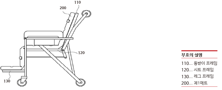 메인프레임은 사각 틀 형상으로 제1매트를 받칠 수 있다. 하단부에 환자 이송 장치 이동을 위한 바퀴 등과 같은 이동 부재 포함이 가능하다. 또한 [도면 2]처럼 등받이 프레임(110)과 시트 프레임(120), 레그 프레임(130)을 포함한다. 등받이 프레임(110)과 시트 프레임(120), 레그 프레임(130)은 차례대로 상호 인지 결합해 침대 형태에서 의자 형태로 상호 변형될 수도 있다.
