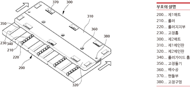 [도면 13]과 같이 제1매트(200)에 롤러가이드 홈이, 제2매트(300)에 롤러가 갖춰져 제1매트(200) 롤러가이드 홈에 제2매트(300) 롤러가 들어가도록 배치될 수도 있다. 제2매트(300)는 [도면 6]과 같이 서로 탈착 가능한 한 쌍의 메인판과 메인판 일측부에 형성된다. 한 쌍의 메인판을 서로 탈착할 수 있게 결합시키는 결합부(330)를 포함할 수 있다.