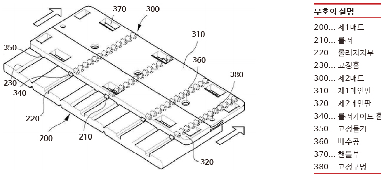 하부에는 상기 롤러(210)가 달릴 수 있는 롤러가이드 홈(340)이 갖춰져 있으며 좌우로 슬라이딩할 수 있는 제2매트(300)를 포함한다. 제2매트(300)는 서로 탈착 가능한 제1메인판(310)과 제2메인판(320)을 포함한다.