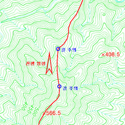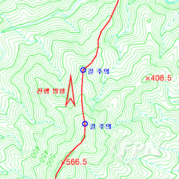 그다음 계획한 코스에서 주요 지점들을 선정해 펜으로 표시한다. 여기서 주요 지점이란 길주의 지점과 체크포인트로 구분할 수 있다. ‘길주의’ 지점이란 길을 잘못 들기 쉬운 지점으로 능선의 분기점과 계곡의 합류점을 뜻한다. 올라갈 능선의 분기점에서는 길을 잘 잃어버리지 않기 때문에 [그림 1]과 같이 내려갈 능선의 분기점에만 ‘길주의’ 표시를 해 둔다.
